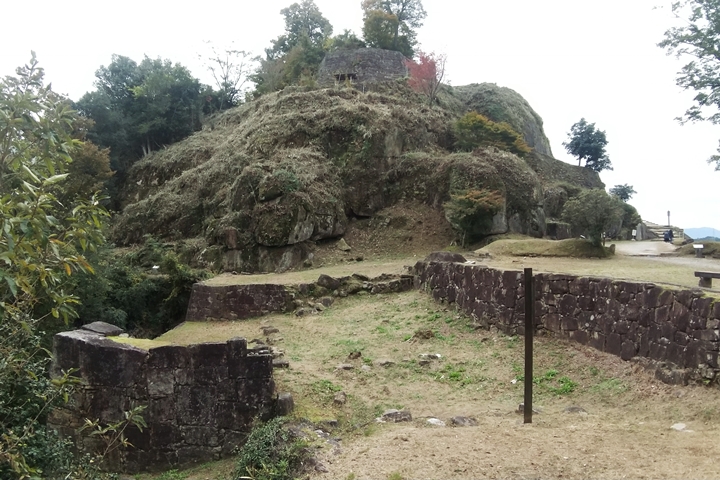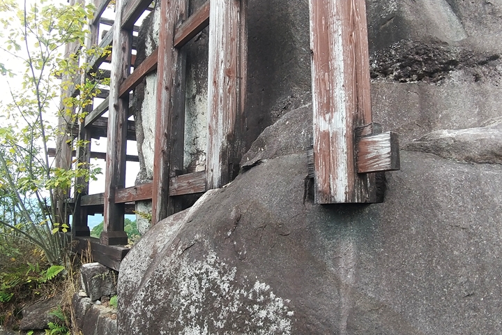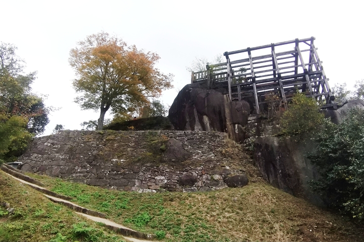 岩を足場に支柱をたてその上に建物をすえる懸造が築城に取り入れられていること。