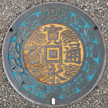 ➀砂絵の寛永通宝、町の木マツ